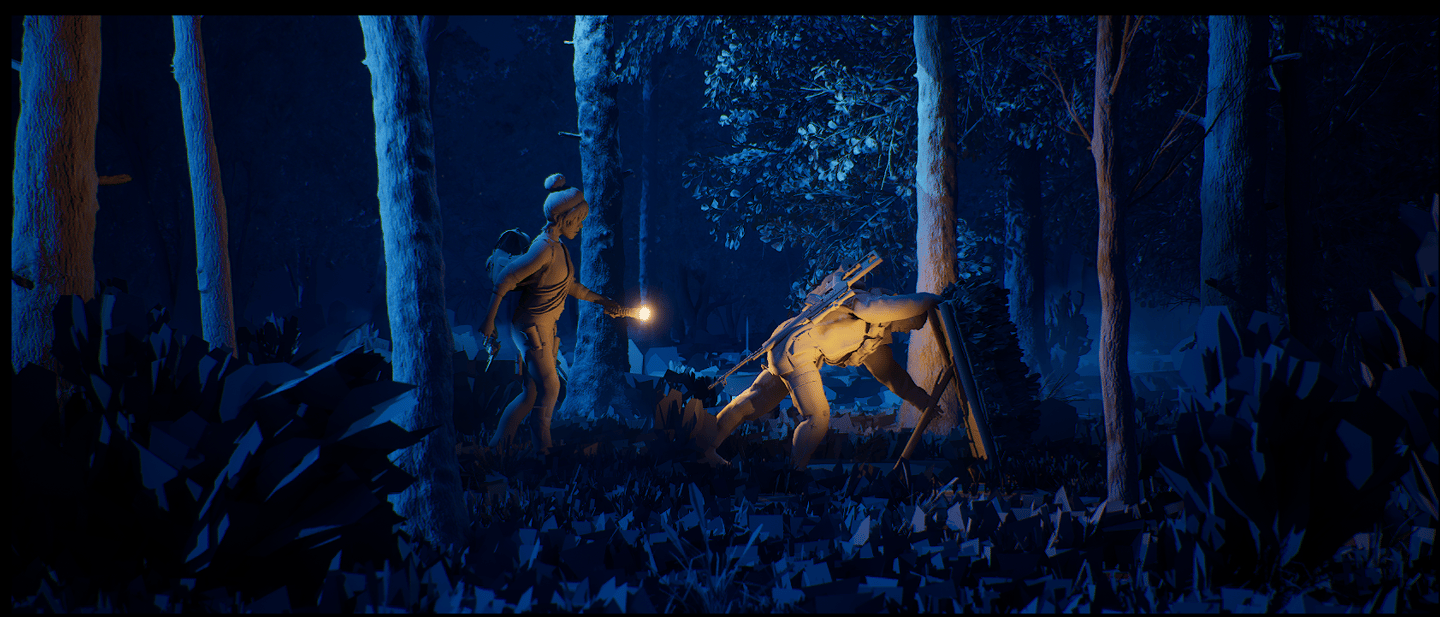 Cena montada e iluminada no Unreal Engine 5. O desafio principal foi equilibrar a densidade da neblina para destacar o feixe da lanterna, mantendo a legibilidade do fundo noturno.